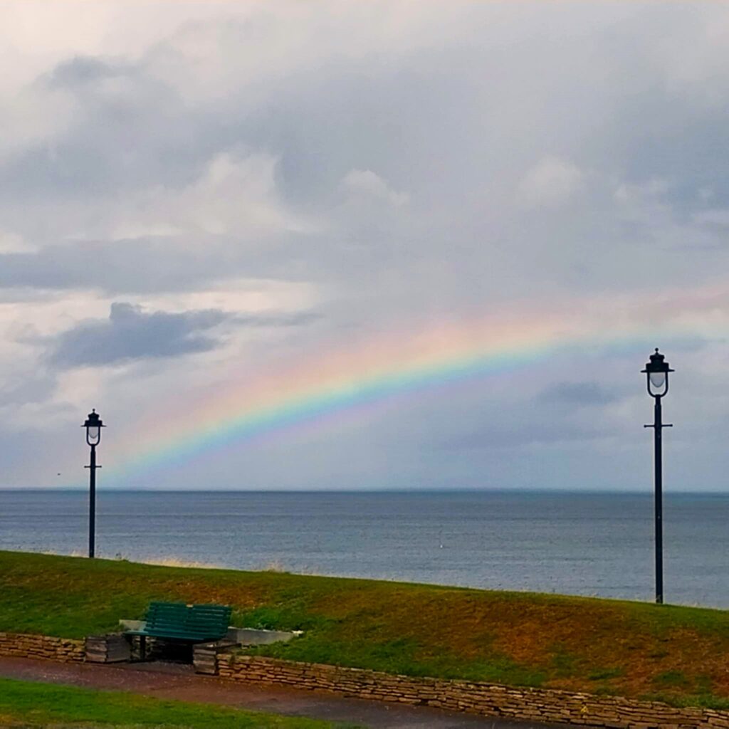 Picture this. On holiday in Whitby, walking along West Cliff, looking out to sea. It has rained all morning, and is now reduced to a dreich mizzle. The sky lightens as the sun turns some of the clouds into a festival of cream and grey Lalique. Then, across the horizon, overarching two Victorian repro street lamps, a rainbow in watercolour lightens the sea and surrounding dark clouds.